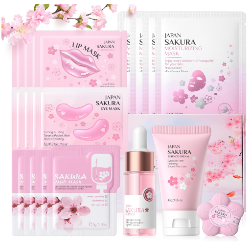 Incluye crema hidratante, suero, esencia, mascarilla facial, mascarilla de barro, mascarilla para ojos, mascarilla labial y sales de baño, cubriendo todas las necesidades de la piel.